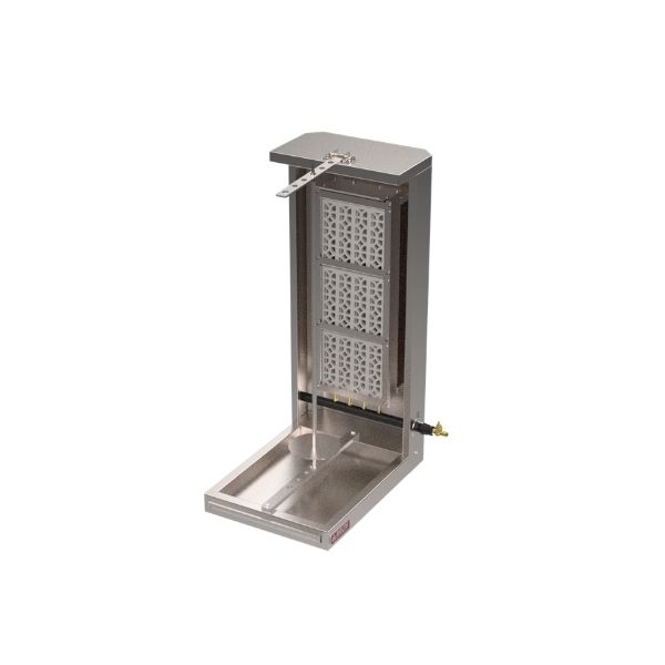 Asador al pastor á Capacidad: 35 kg á Charola recolectora de residuos á Bisagra superior á 4 patas niveladoras.